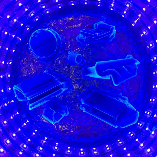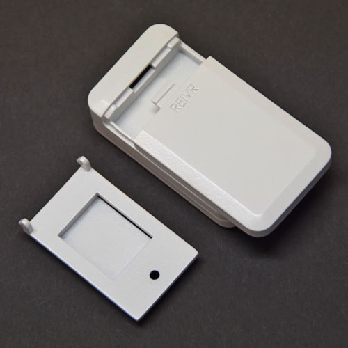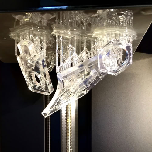 Gallery: 1 3D prints UV curing. 2 3D printed parts coming off sterolithography machining. 3 Model casings. 4 Model casings with working electronics for trials. 5 Wearable model electronic tag. 6 Simulation of metal casting. 7 Working latch prototype. 7 Scale models of seating for display. 9 Scale model using 3D printing plus hand finishing and assembly. 10 Scale model of street bin design. 11 Scale model of street bin cluster. 12 Full size parts for model of range cooker design. 13 Finished model for marketing evaluation. 14 Machine and hand assembled electronics casing. 15 Electronics casing inserted into working prototype. 16 Machined and hand assembled model before painting. 17 Painted model in finished working unit. 18 Machined, fabricated and hand finished set of lamp parts. 19 Lamp parts assembled and mounted to camcorder. 20 Full size mockup of coffee machine. 21 Bottle models for marketing evaluation. 22 Hand carved Waterford city crest. 23 City crest in-situ. 24 Abbott.